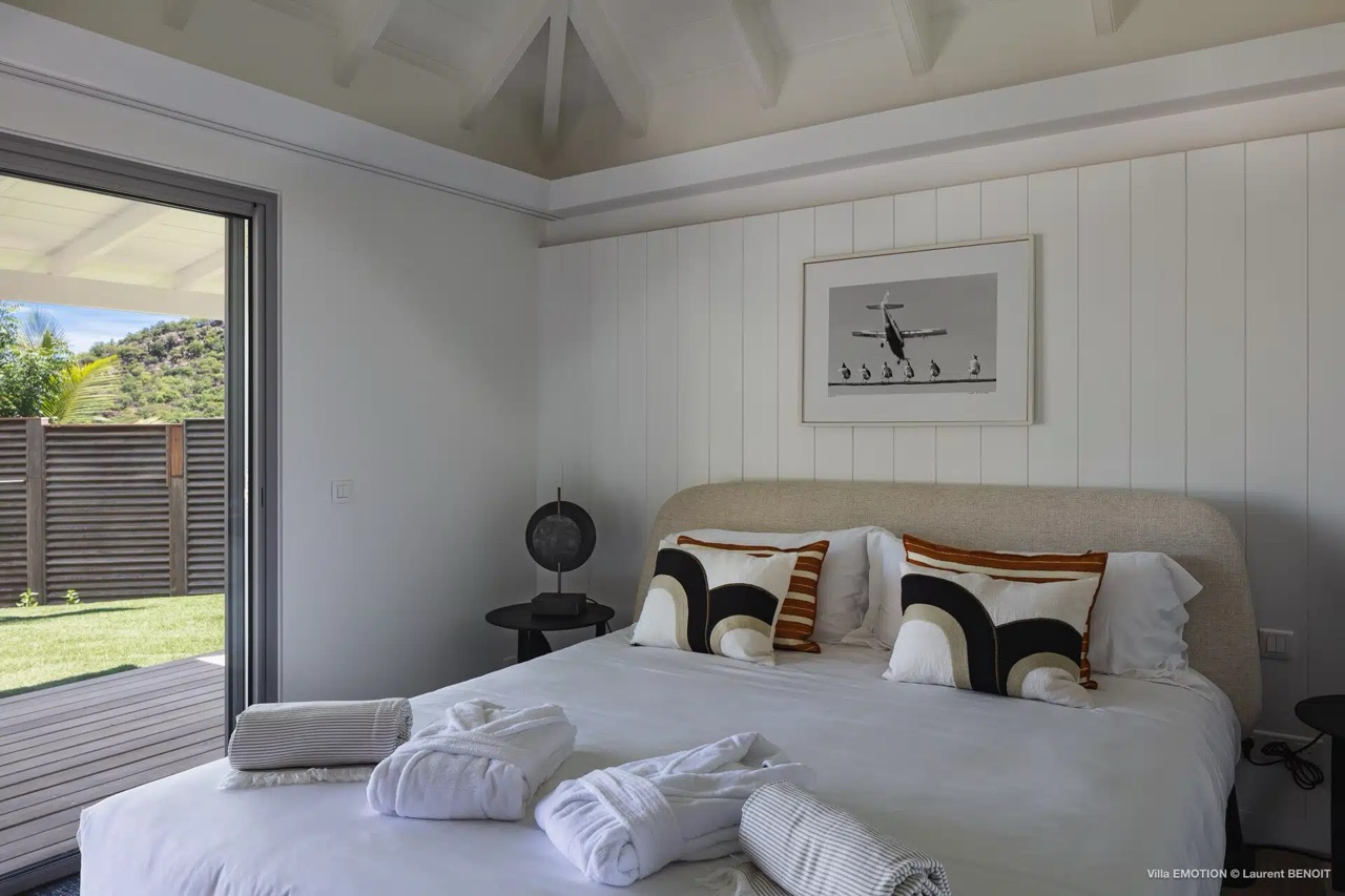 Fresh from a complete renovation, Villa Emotion has made a stylish entrance onto the St. Barth rental market. The home captures the essence of laid-back Caribbean living while showcasing refined materials, contemporary comfort, and beautifully curated designer pieces. Thoughtfully designed, the layout makes Villa Emotion ideal for an adult family or a group of friends. Every space has been created to evoke the true spirit of vacation — ease, togetherness, serenity, and a sense of wellbeing. Set in St. Jean, the villa enjoys a convenient location close to the roads leading toward Saline and Lurin. The living room and kitchen share an open, welcoming environment that can be fully air-conditioned. Indoor and outdoor dining options allow meals to unfold in the breeze or in cool comfort, while the terrace centers around a heated pool lined with sun loungers. The modern kitchen is fully equipped, featuring sleek stainless-steel cabinetry. One bedroom is accessible from the main living area, while the remaining suites are set in separate bungalows — one near the entrance and two positioned side by side at the far end of the property. Each bedroom offers an ensuite bathroom, an outdoor shower, a television, and a dedicated workspace, ensuring comfort and privacy throughout the stay.