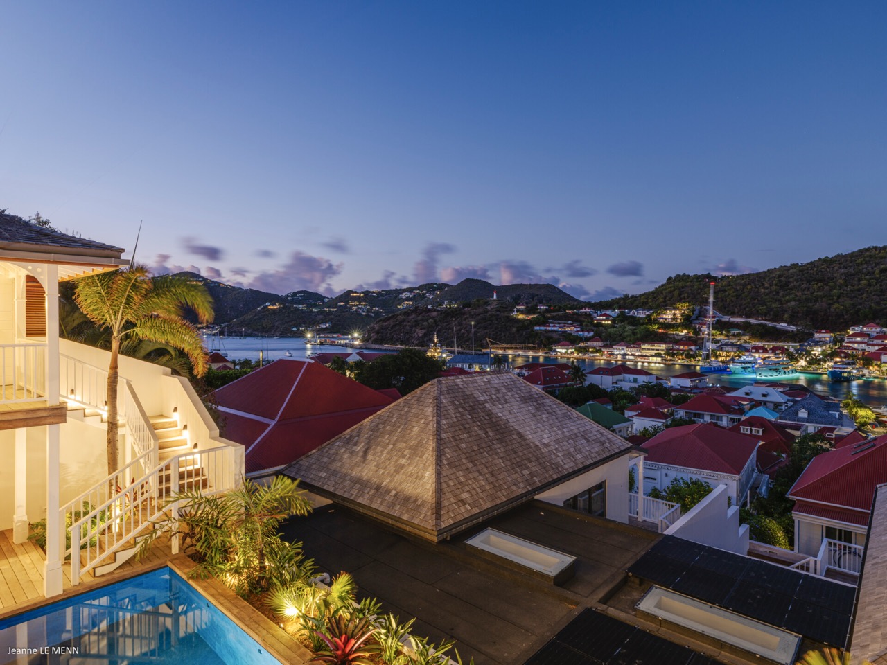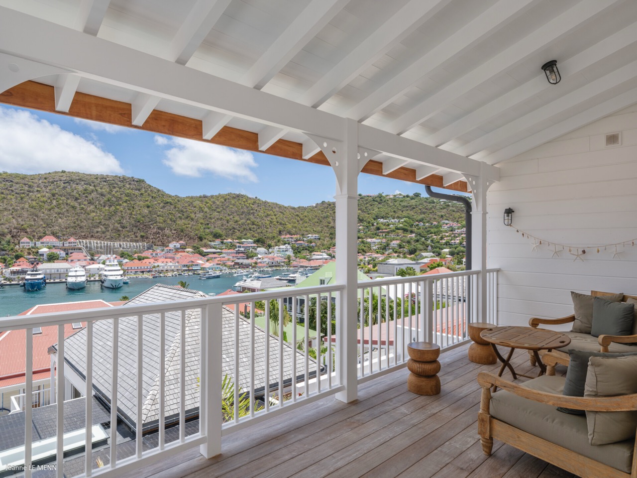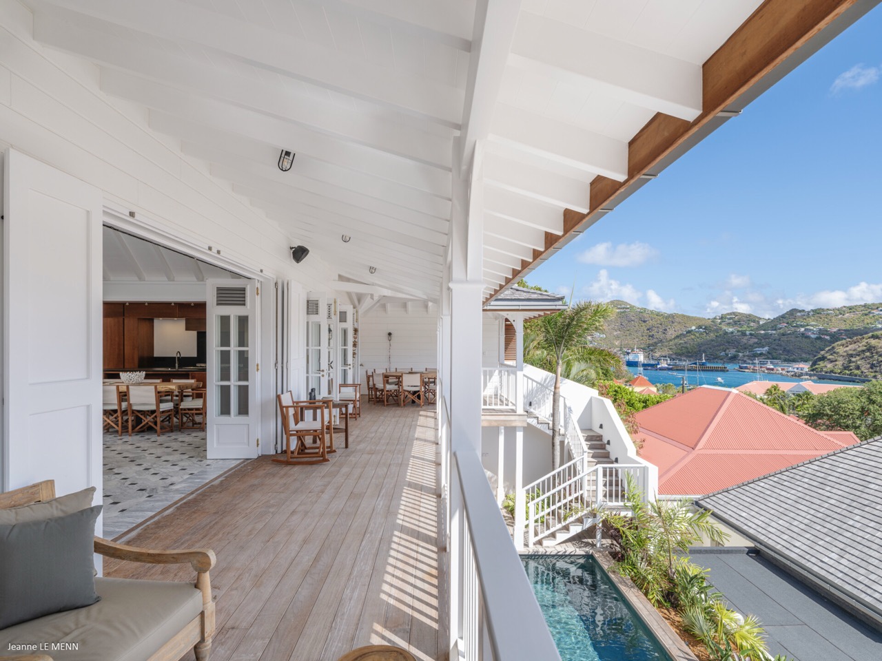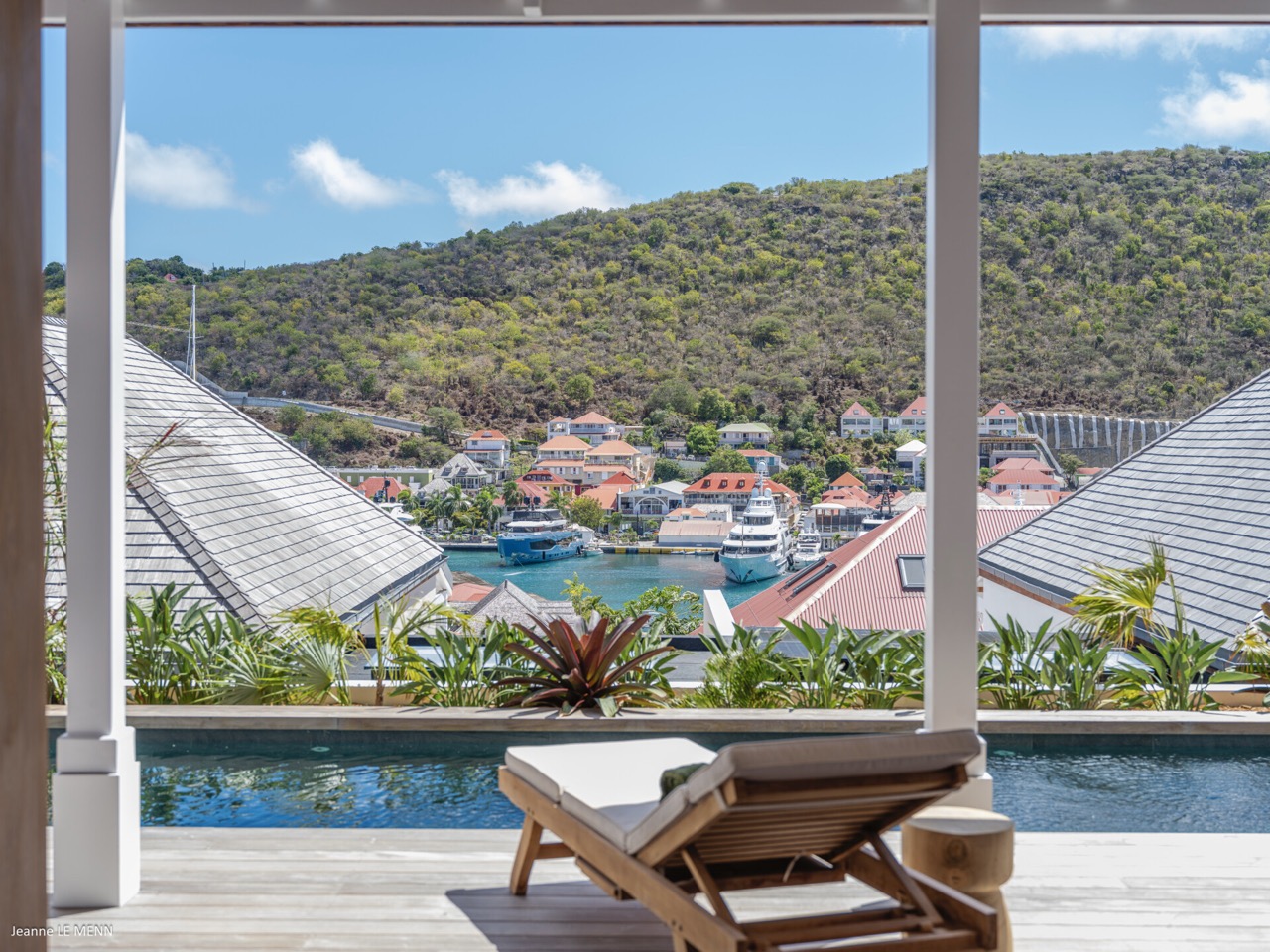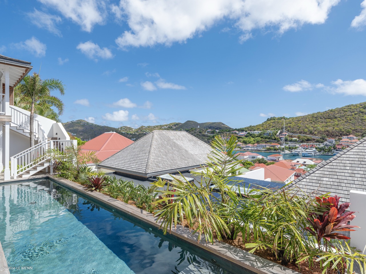 Villa Hippocampe is a bright and inviting four-bedroom retreat set along the left hillside of Gustavia’s harbor, unfolding over two levels with the ease and charm of a contemporary Caribbean manor. Its generous layout makes it ideal for groups, offering a variety of indoor and outdoor living areas where everyone can relax comfortably while still enjoying privacy. Inside, high ceilings and soft, coastal tones establish a calm, breezy atmosphere. Caribbean artwork adds warmth and personality throughout. On the upper level, the main living space opens onto a terrace perfectly positioned for watching the harbor’s rhythm. A fully equipped kitchen—complete with a small auxiliary prep area—adjoins the living room, while both indoor and outdoor dining areas give you the choice between meals in cool comfort or dinners overlooking the twinkling lights of Gustavia. The primary bedroom also sits on this level, peaceful and spacious, with soothing views of the port and direct access to the terrace. Three additional bedrooms are located downstairs: two beside the pool and a third set slightly apart to ensure extra seclusion. Each bedroom feels airy and restful, designed for easy island living. The pool terrace is a natural gathering spot, with a heated pool, sun loungers, and shaded corners that invite long conversations or quiet moments with a book. A small kitchenette beside the pool adds convenience, making outdoor living seamless—from late-afternoon dips to relaxed lunches in the sun. In the heart of Gustavia, Villa Hippocampe blends modern comfort with the lively charm of harborfront life. With its views, space, and effortless access to the town’s boutiques, restaurants, and galleries, it offers an ideal setting for guests seeking both sophistication and simplicity by the sea.