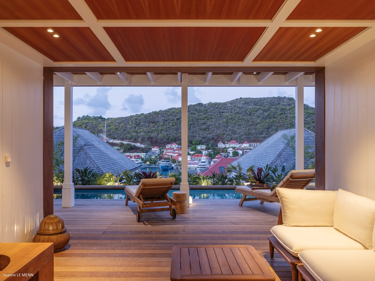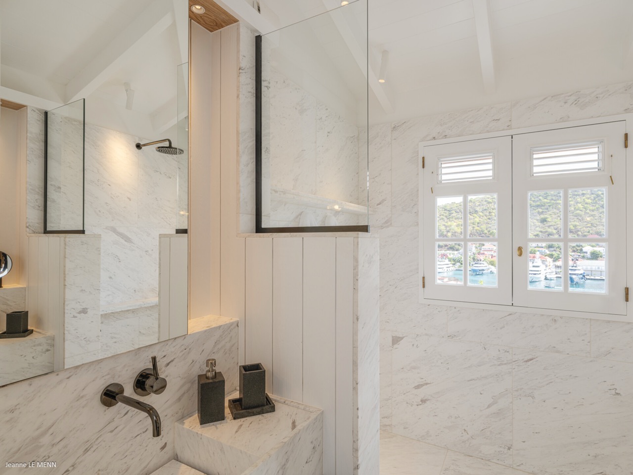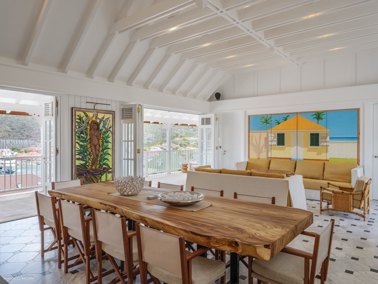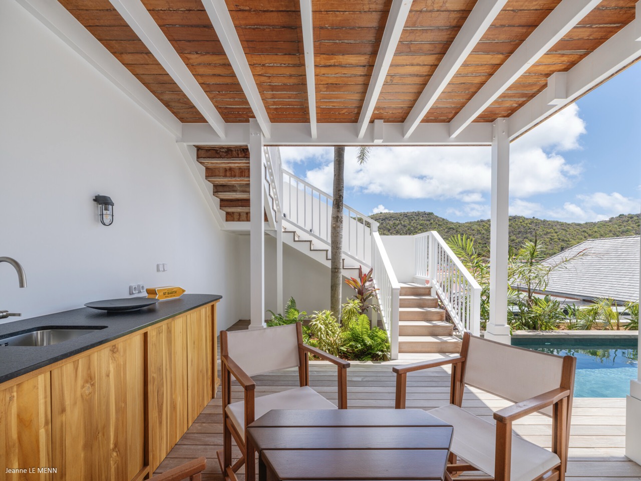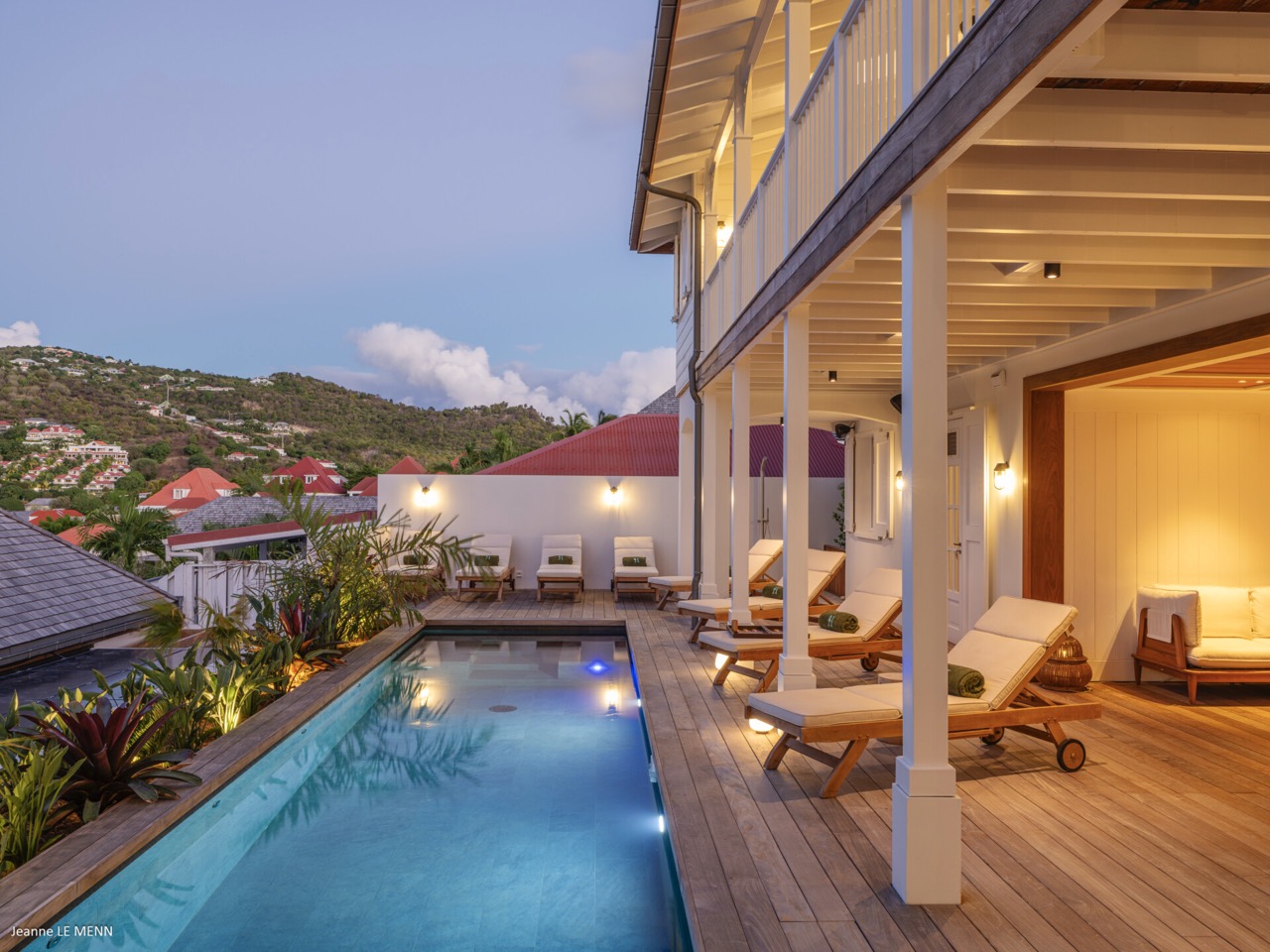 Villa Hippocampe is a bright and inviting four-bedroom retreat set along the left hillside of Gustavia’s harbor, unfolding over two levels with the ease and charm of a contemporary Caribbean manor. Its generous layout makes it ideal for groups, offering a variety of indoor and outdoor living areas where everyone can relax comfortably while still enjoying privacy. Inside, high ceilings and soft, coastal tones establish a calm, breezy atmosphere. Caribbean artwork adds warmth and personality throughout. On the upper level, the main living space opens onto a terrace perfectly positioned for watching the harbor’s rhythm. A fully equipped kitchen—complete with a small auxiliary prep area—adjoins the living room, while both indoor and outdoor dining areas give you the choice between meals in cool comfort or dinners overlooking the twinkling lights of Gustavia. The primary bedroom also sits on this level, peaceful and spacious, with soothing views of the port and direct access to the terrace. Three additional bedrooms are located downstairs: two beside the pool and a third set slightly apart to ensure extra seclusion. Each bedroom feels airy and restful, designed for easy island living. The pool terrace is a natural gathering spot, with a heated pool, sun loungers, and shaded corners that invite long conversations or quiet moments with a book. A small kitchenette beside the pool adds convenience, making outdoor living seamless—from late-afternoon dips to relaxed lunches in the sun. In the heart of Gustavia, Villa Hippocampe blends modern comfort with the lively charm of harborfront life. With its views, space, and effortless access to the town’s boutiques, restaurants, and galleries, it offers an ideal setting for guests seeking both sophistication and simplicity by the sea.