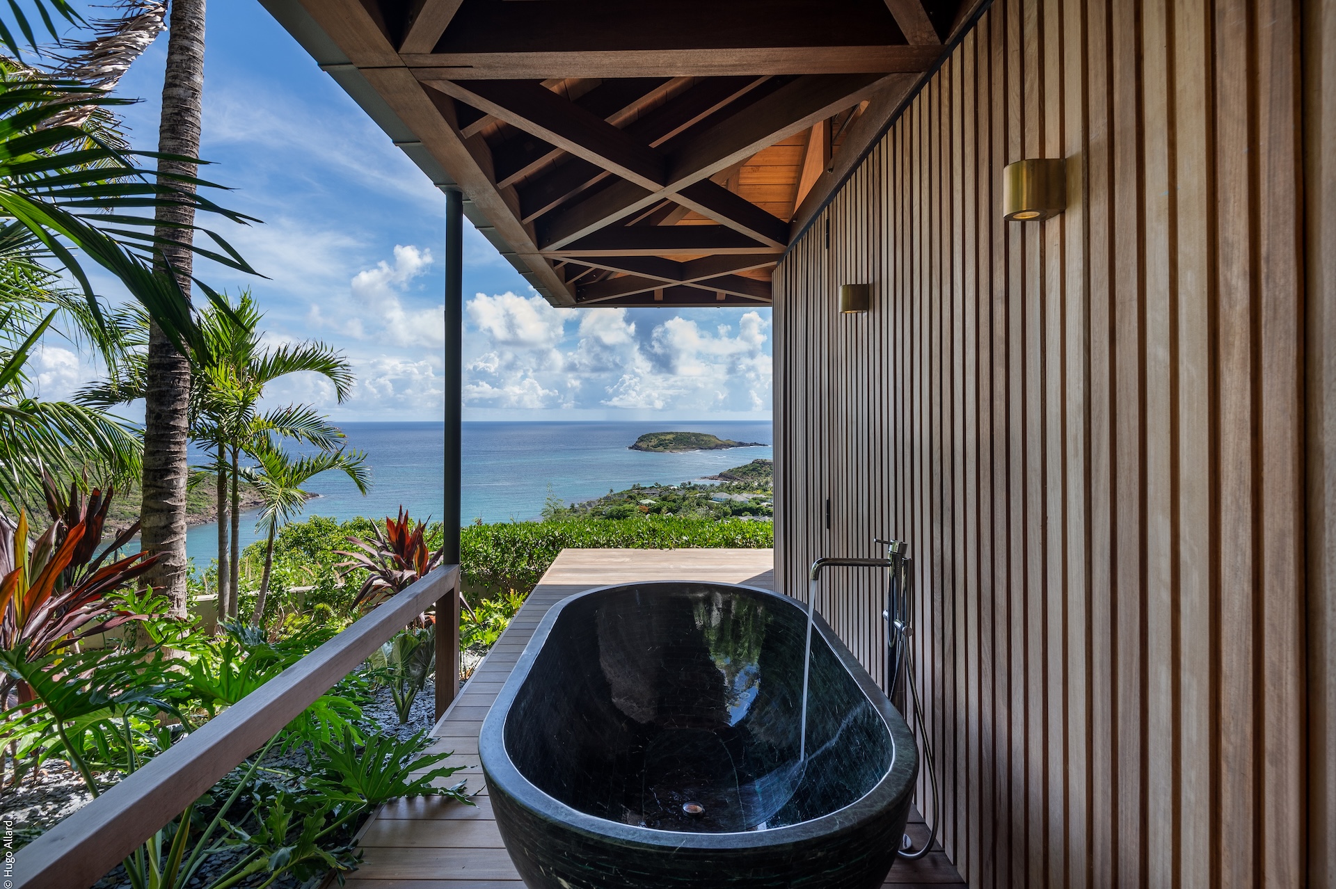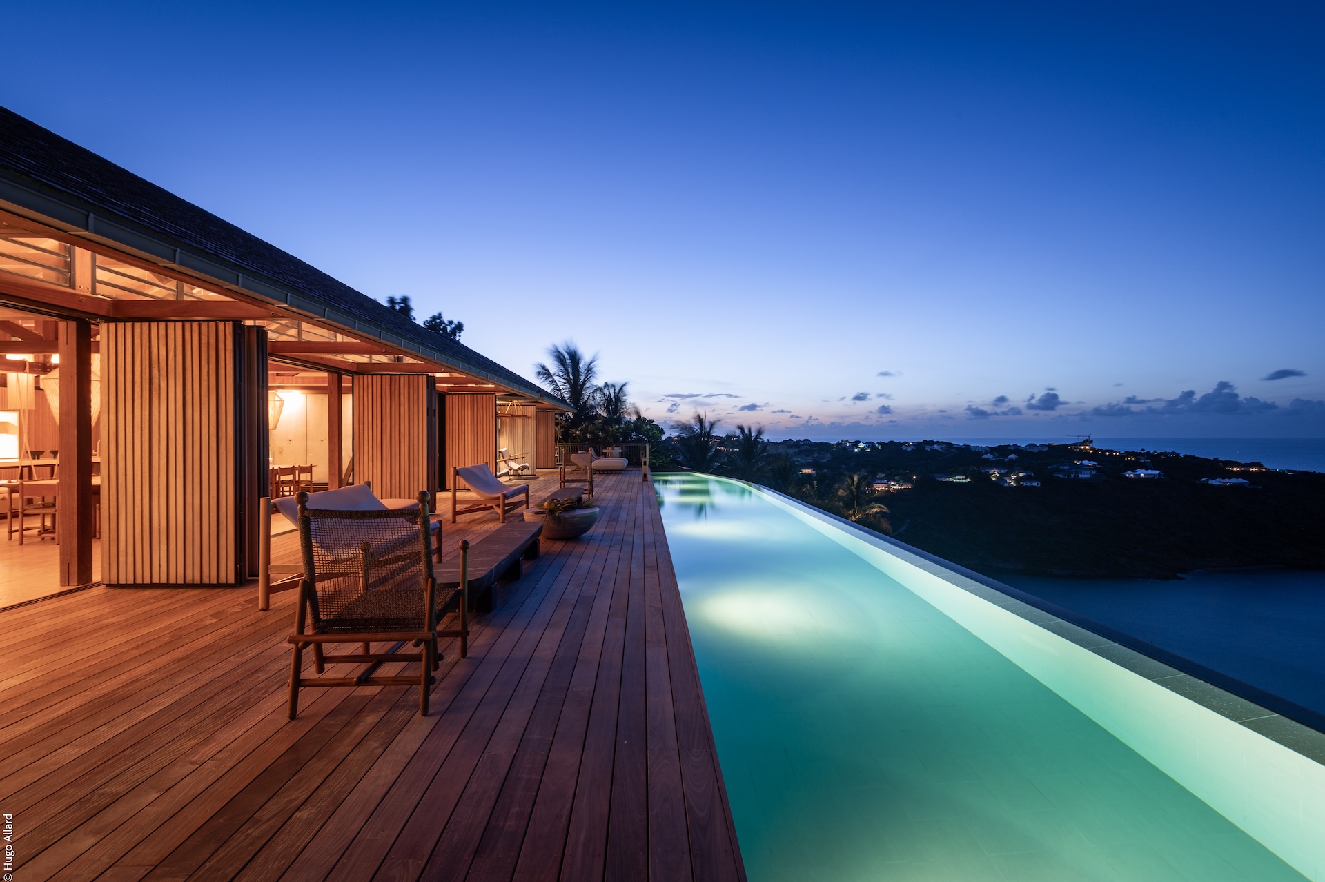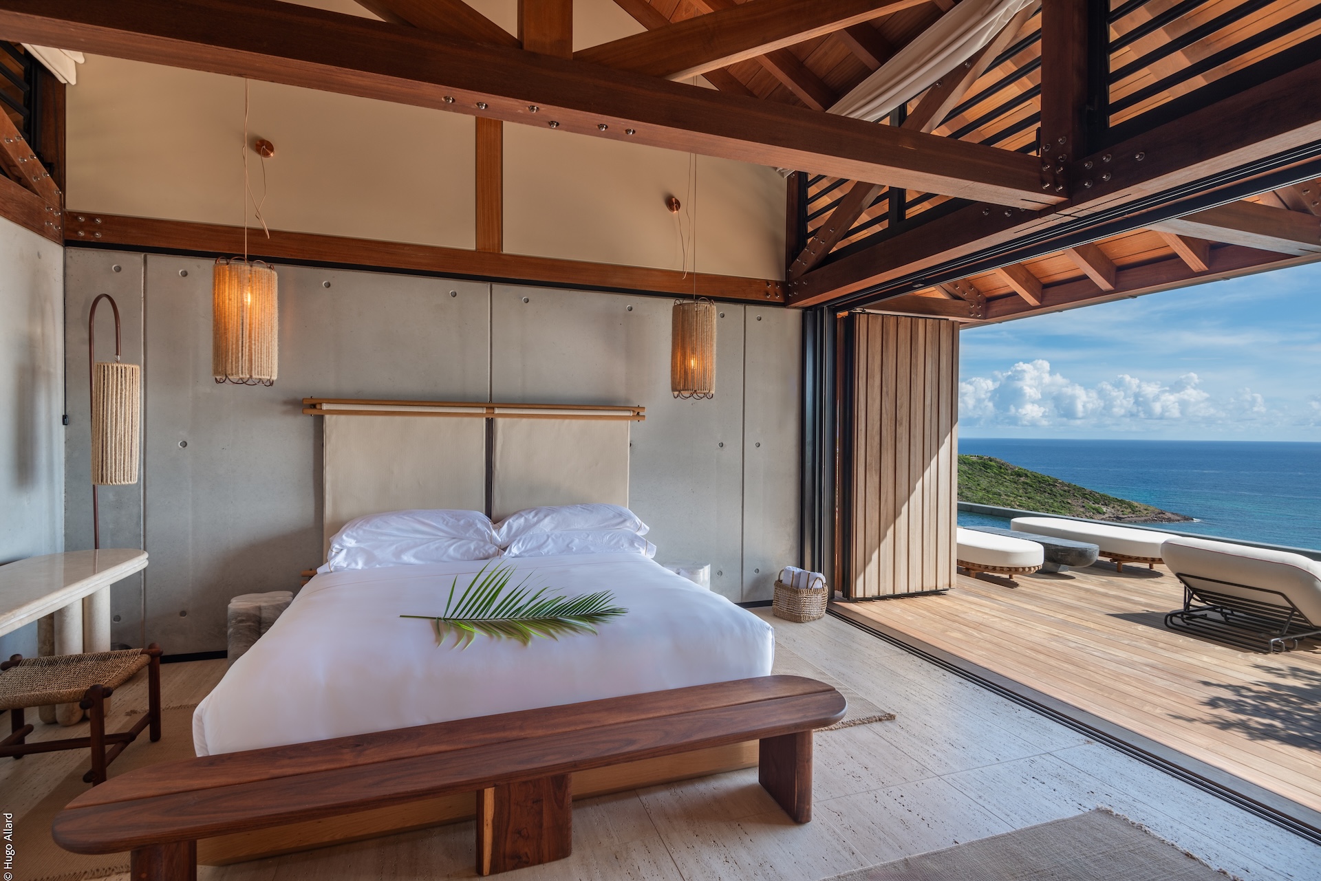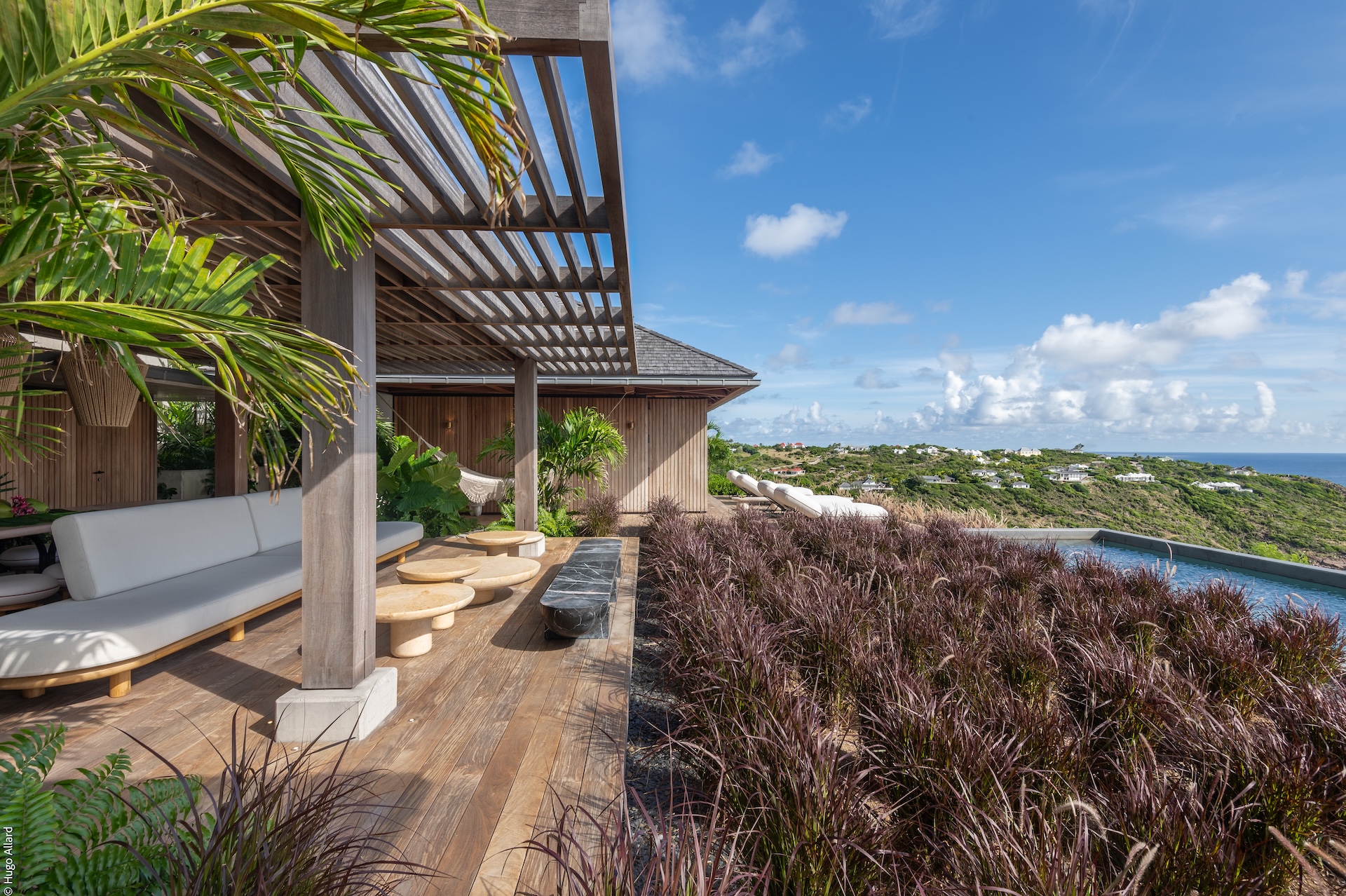 Outdoors, Manoir Voltaire features a striking natural-stone infinity pool that appears to spill toward the sea, framed by a generous sun deck and a selection of shaded lounges. The setting offers complete privacy, creating an atmosphere of serene indulgence where guests can unwind while enjoying uninterrupted ocean views. Ti Voltaire is nestled within its own lush tropical garden. This more intimate villa mirrors the refined aesthetic of Manoir Voltaire, with its own sparkling pool and private parking, providing a secluded retreat while maintaining the same architectural elegance and peaceful ambiance.