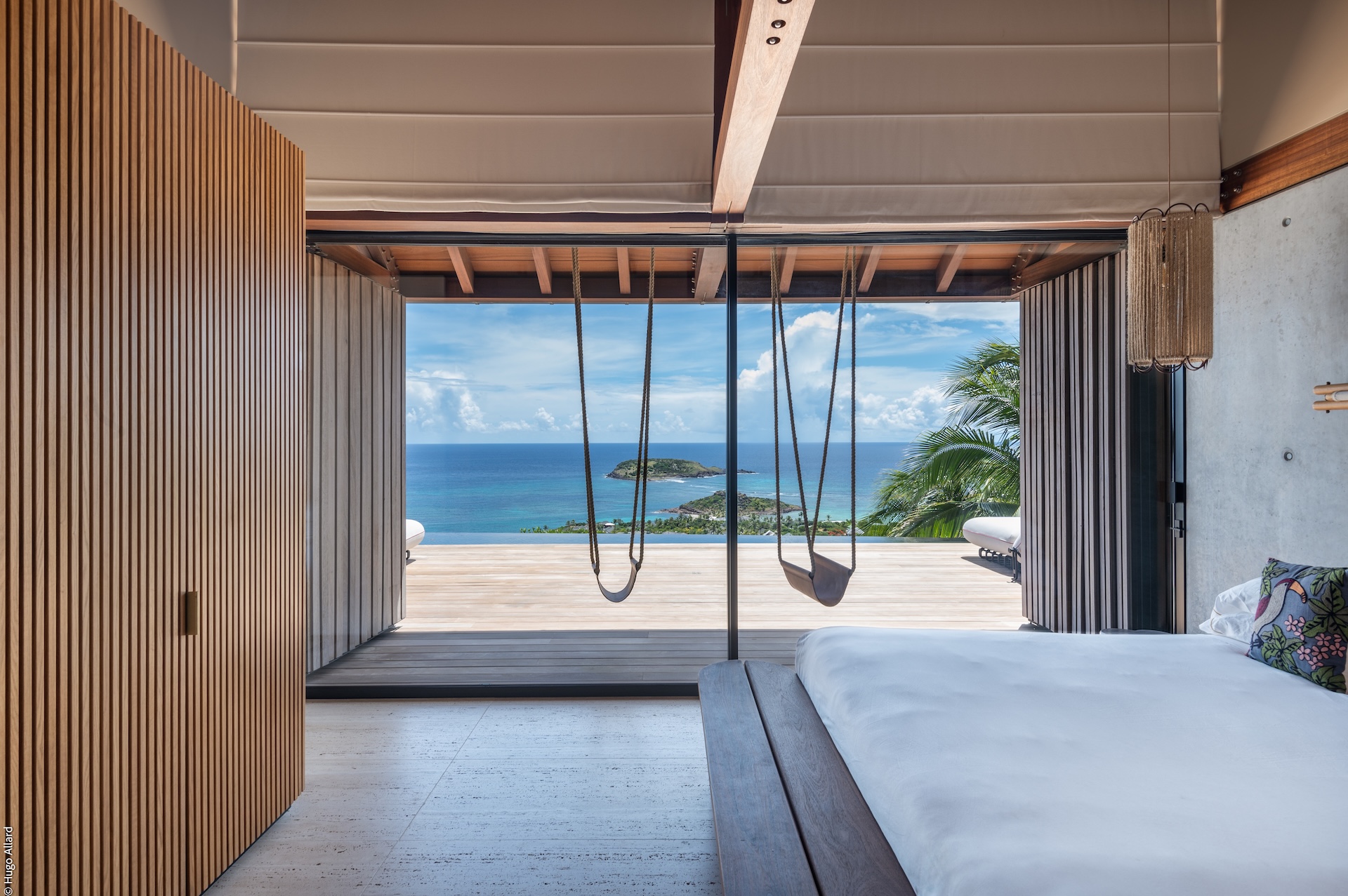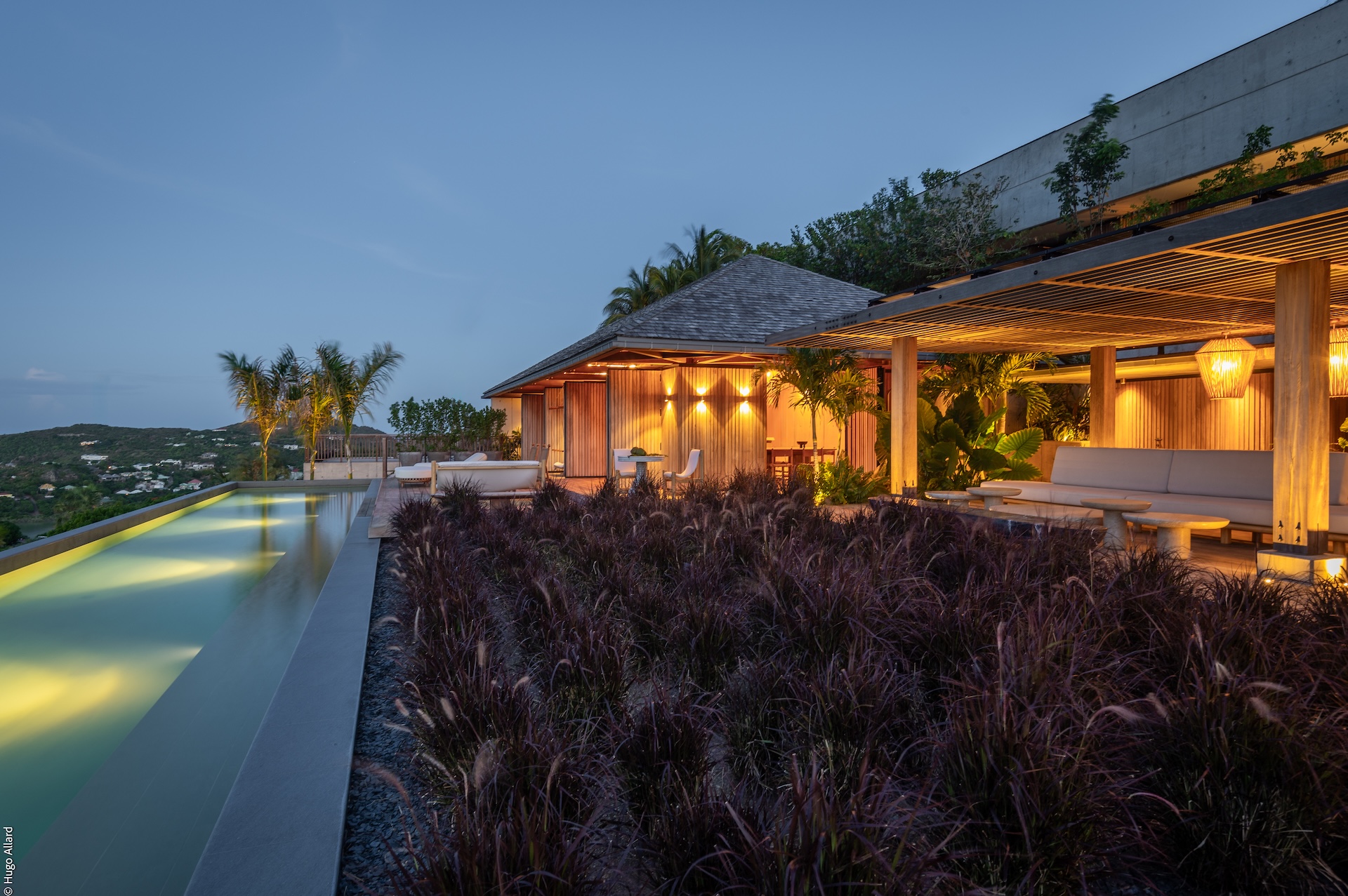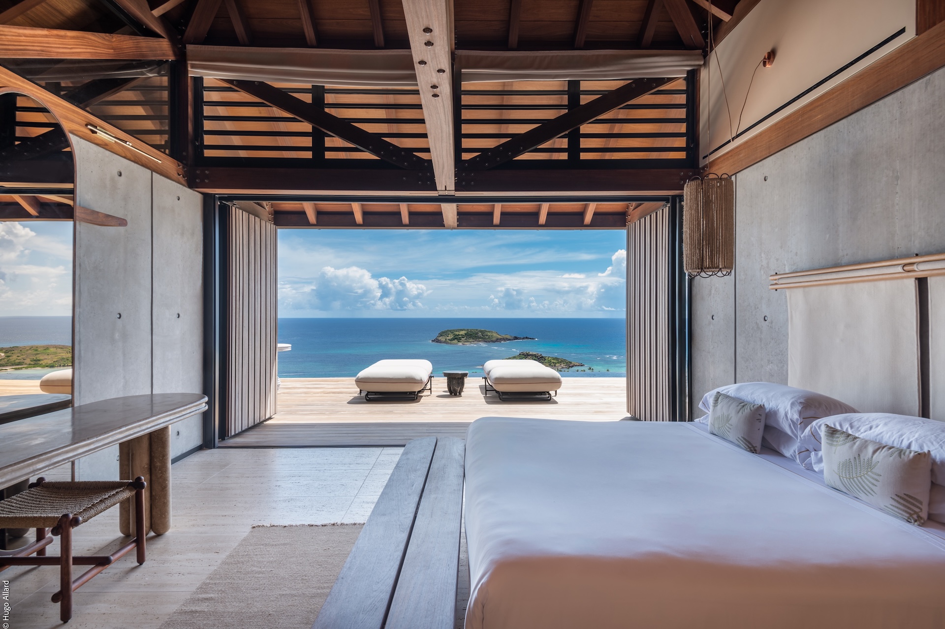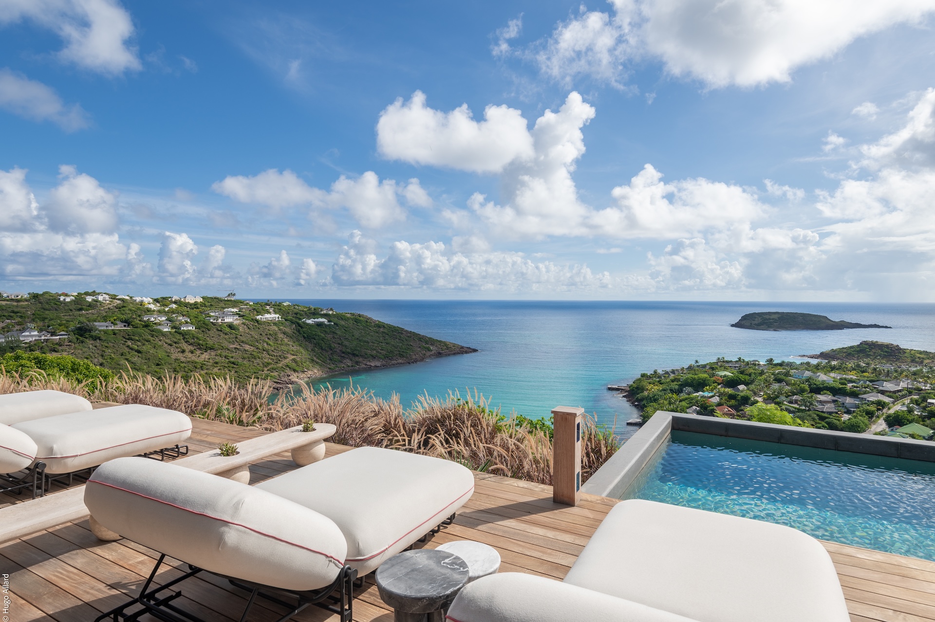 Outdoors, Manoir Voltaire features a striking natural-stone infinity pool that appears to spill toward the sea, framed by a generous sun deck and a selection of shaded lounges. The setting offers complete privacy, creating an atmosphere of serene indulgence where guests can unwind while enjoying uninterrupted ocean views. Ti Voltaire is nestled within its own lush tropical garden. This more intimate villa mirrors the refined aesthetic of Manoir Voltaire, with its own sparkling pool and private parking, providing a secluded retreat while maintaining the same architectural elegance and peaceful ambiance.