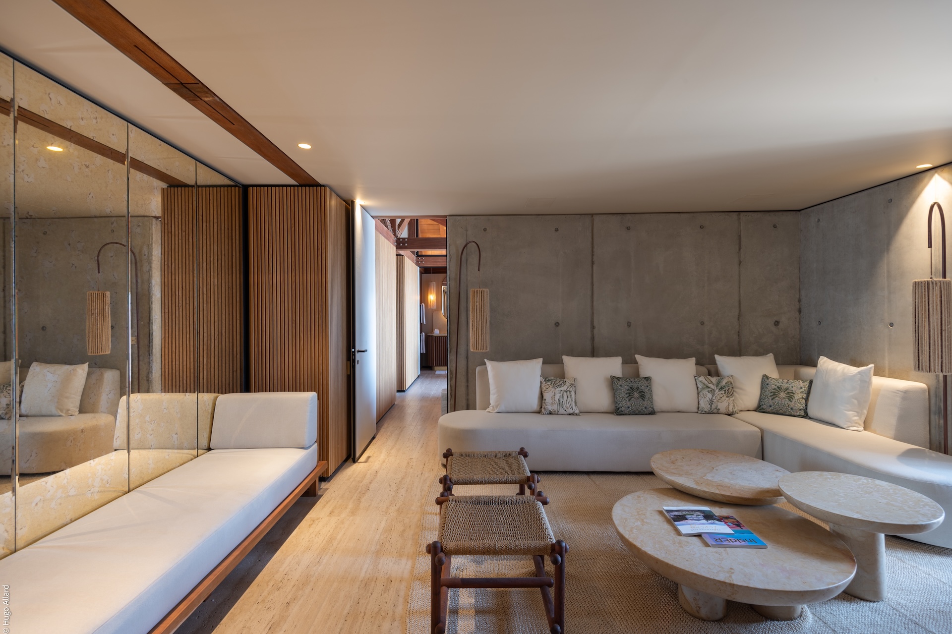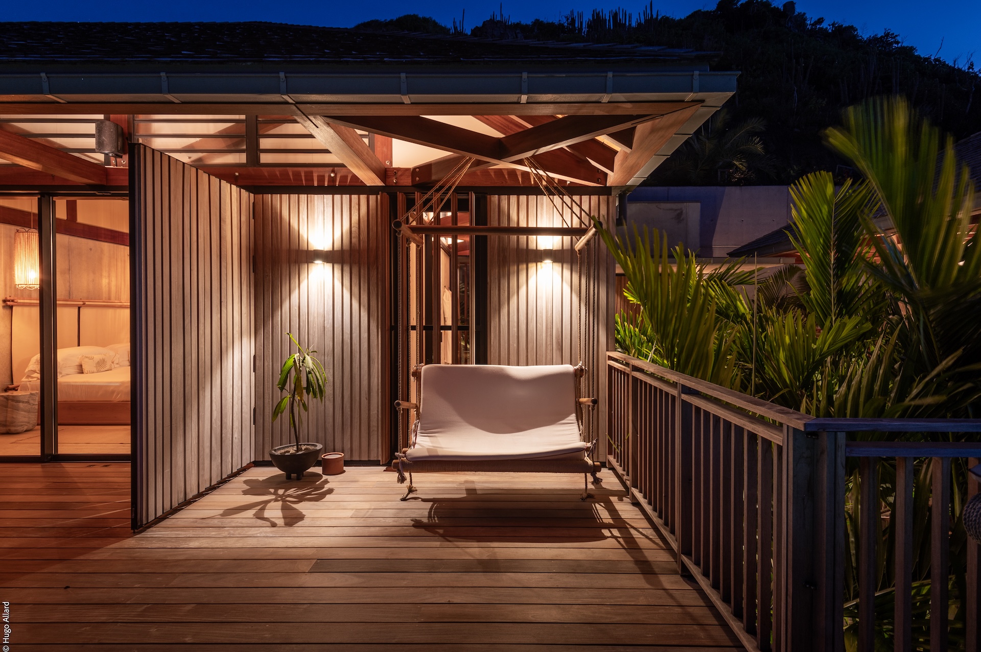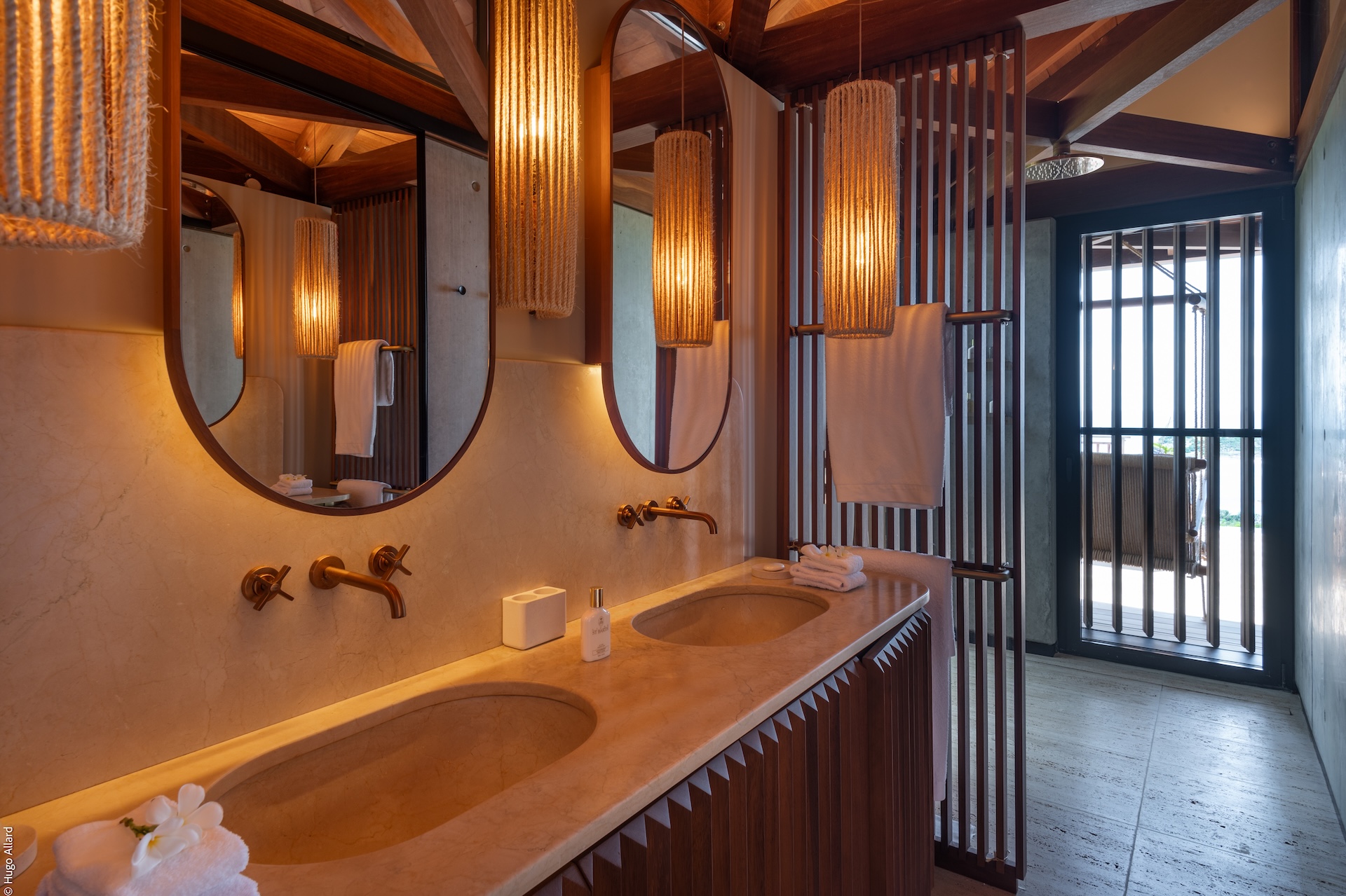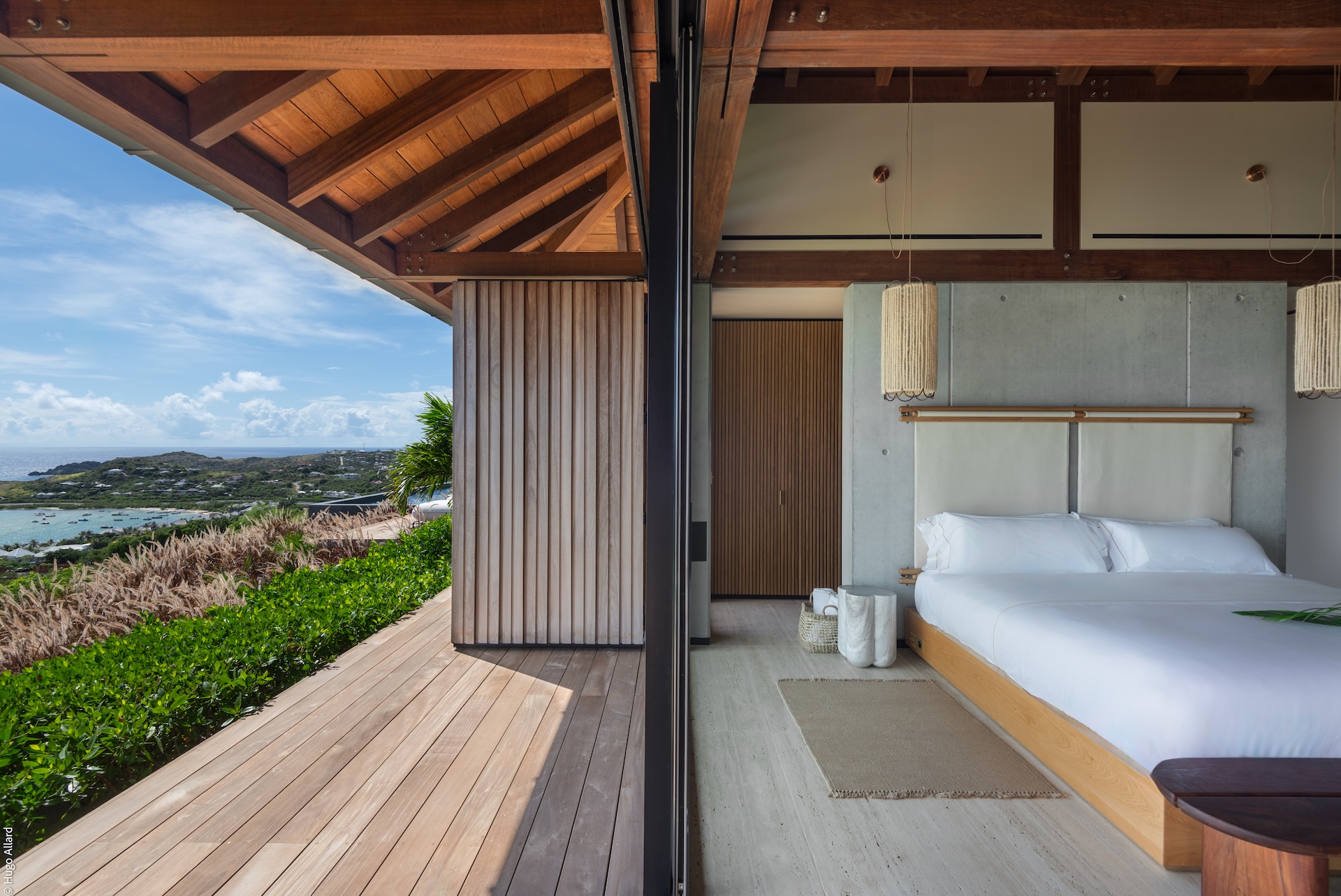 Outdoors, Manoir Voltaire features a striking natural-stone infinity pool that appears to spill toward the sea, framed by a generous sun deck and a selection of shaded lounges. The setting offers complete privacy, creating an atmosphere of serene indulgence where guests can unwind while enjoying uninterrupted ocean views. Ti Voltaire is nestled within its own lush tropical garden. This more intimate villa mirrors the refined aesthetic of Manoir Voltaire, with its own sparkling pool and private parking, providing a secluded retreat while maintaining the same architectural elegance and peaceful ambiance.