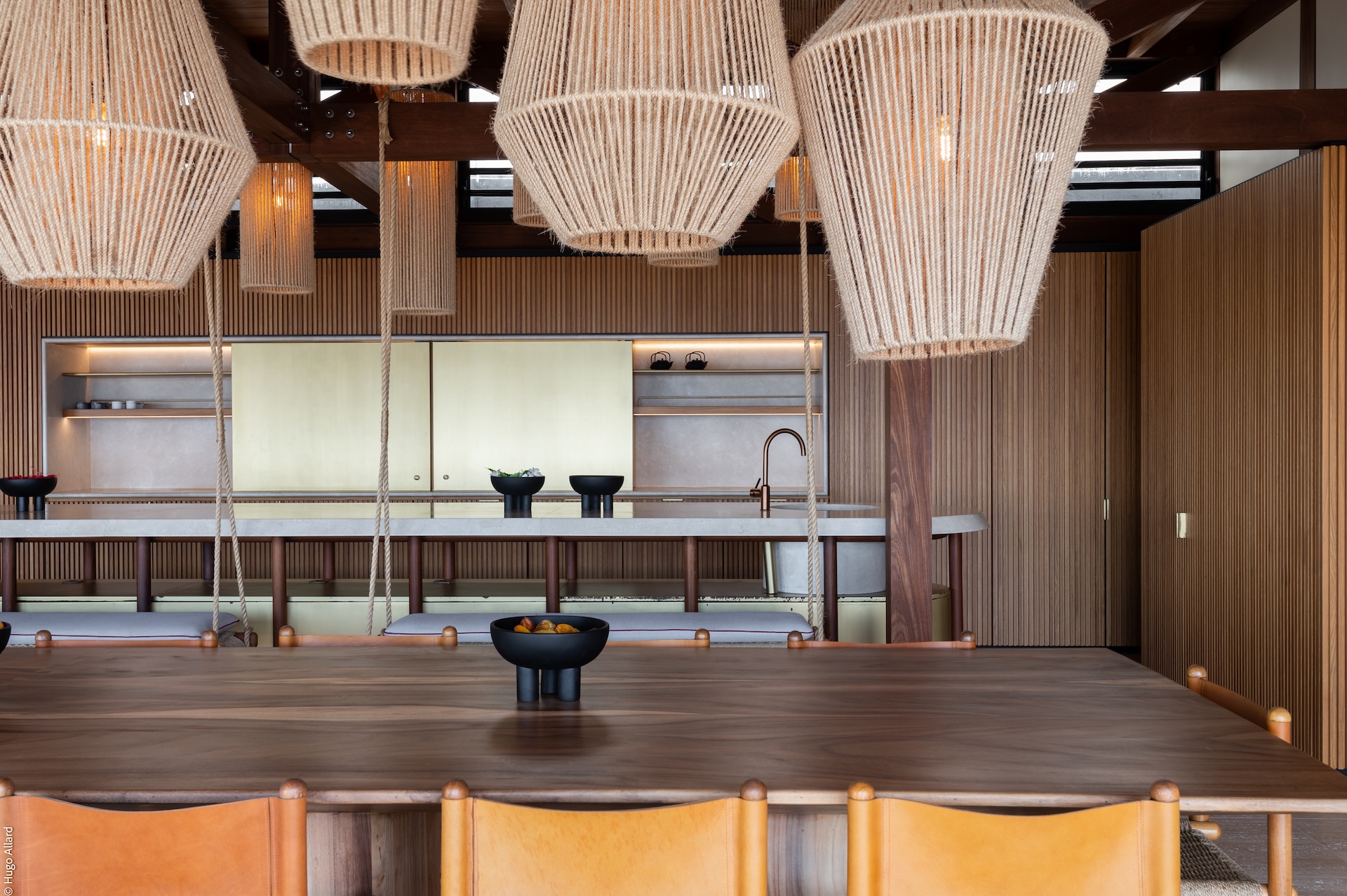 Villa Manoir includes a professional chef’s kitchen, fully air-conditioned and equipped with two sinks, a dishwasher, multiple refrigerated drawers, a plancha, a four-burner gas stove, a warming cabinet, a gas oven, a deep fryer, a microwave, a steam oven, a barbecue, and a full ventilation hood system. A second kitchen, also air-conditioned, serves as a fully equipped support space. Completing the living area, the villa’s TV room provides a cozy retreat, fully air-conditioned and furnished with a smart TV and Apple TV—perfect for quiet evenings or family movie nights. The dining room flows naturally toward the outdoors, offering a graceful space for shared meals against the backdrop of the pool and lagoon. Villa Ti Manoir features its own air-conditioned, fully equipped kitchen designed for everyday convenience and seamless service across the property.
