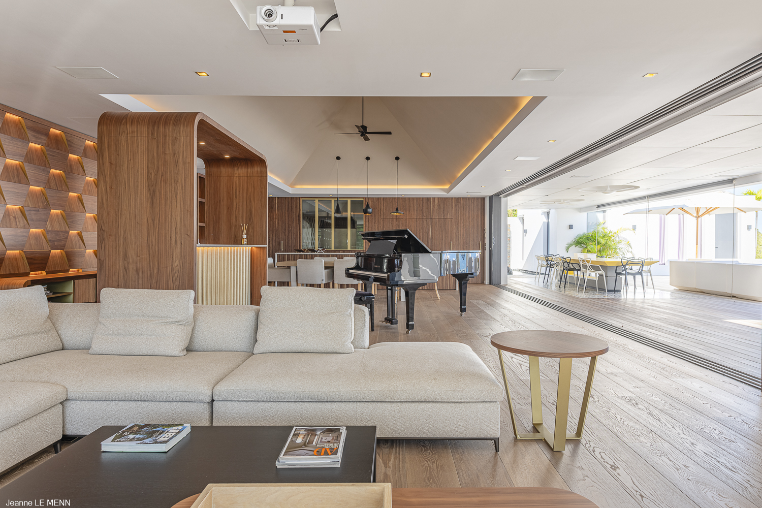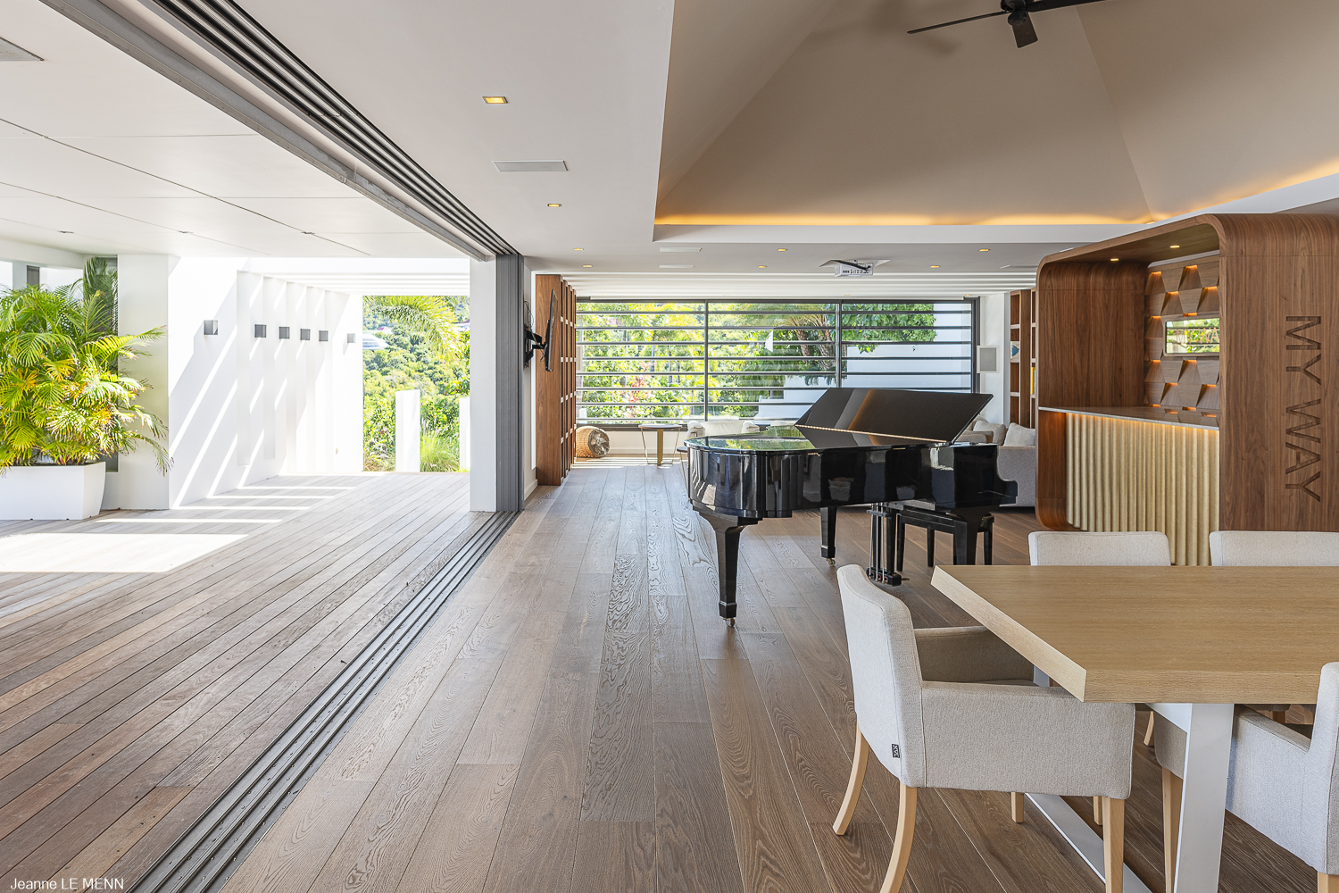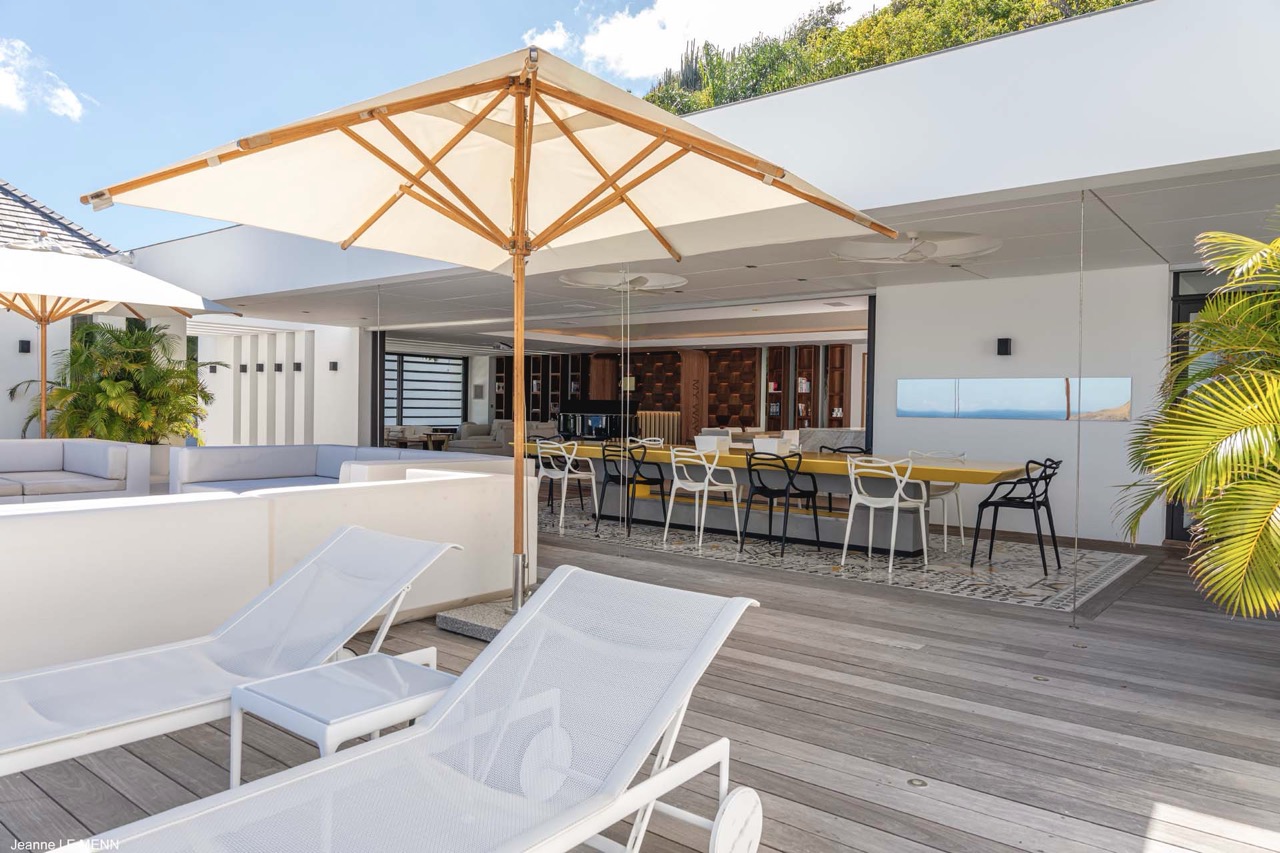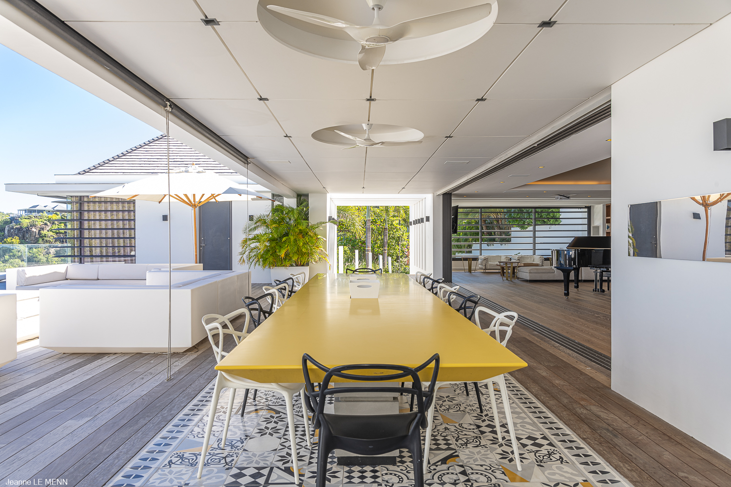 Spacious ocean view air conditioned living room, furnished with large grey sofas, grand piano, ceiling fans, giant screen and video projector with Dish Network, Canal Satellite, DVD player, Sonos sound system inside and outside. Ocean view dining on the covered terrace with large rectangular concrete table for 18 to 20 people next to a lovely basin with water lilies, ceiling fans, remote-controlled screen to protect from the sun / wind / rain.