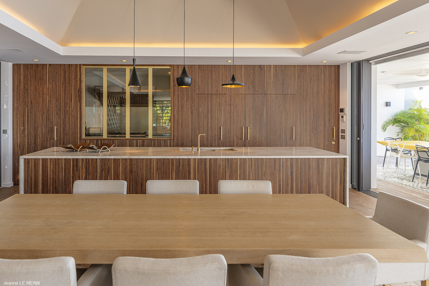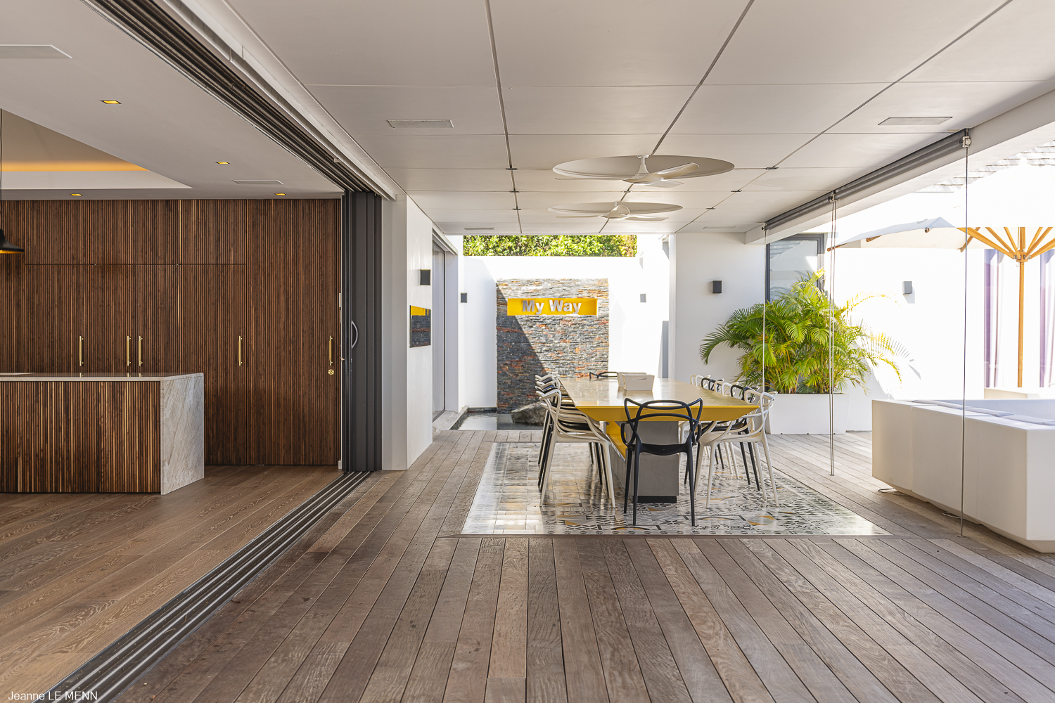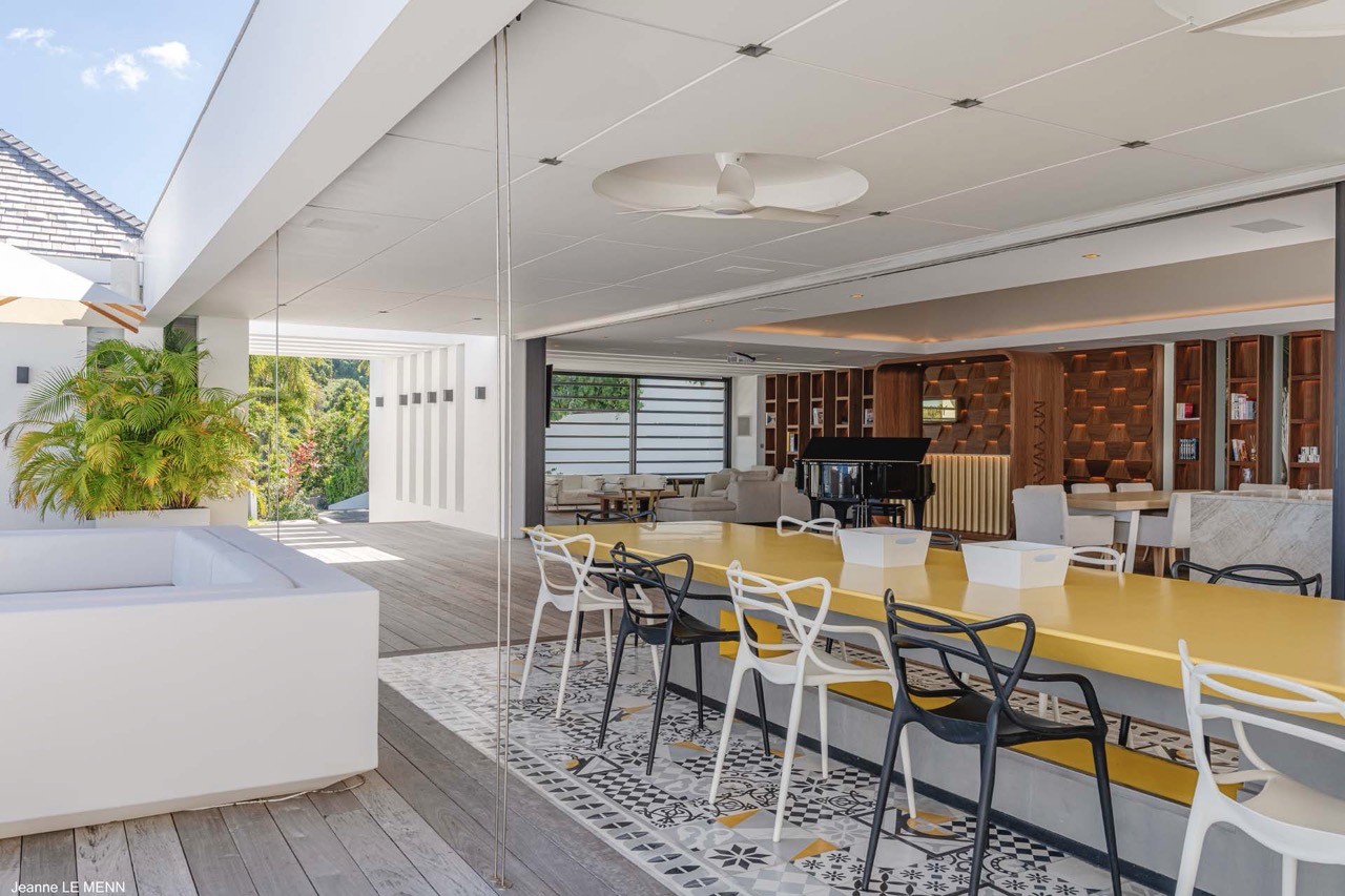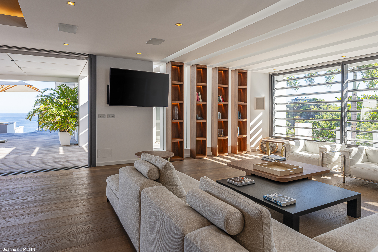 Spacious ocean view air conditioned living room, furnished with large grey sofas, grand piano, ceiling fans, giant screen and video projector with Dish Network, Canal Satellite, DVD player, Sonos sound system inside and outside. Ocean view dining on the covered terrace with large rectangular concrete table for 18 to 20 people next to a lovely basin with water lilies, ceiling fans, remote-controlled screen to protect from the sun / wind / rain.