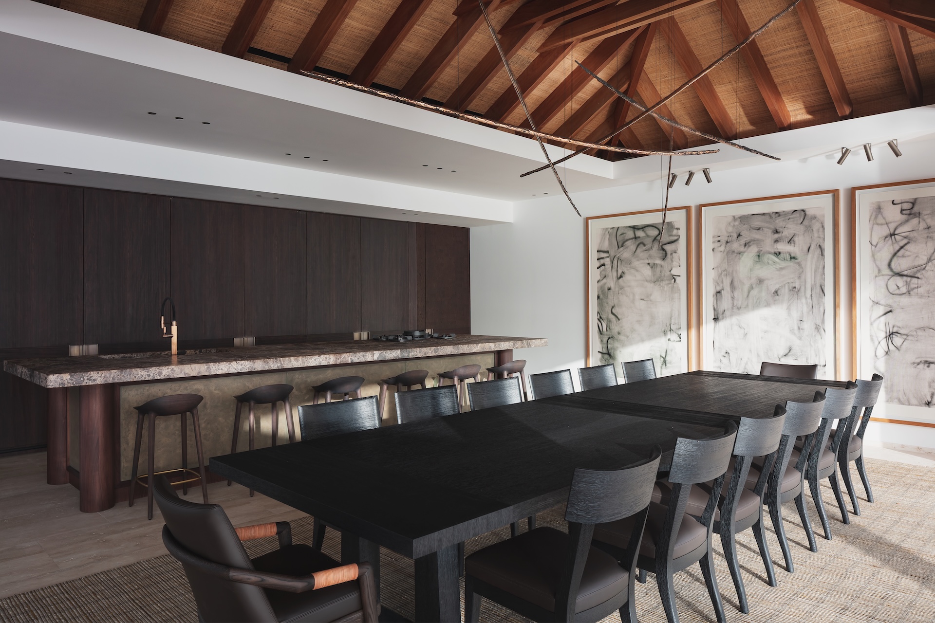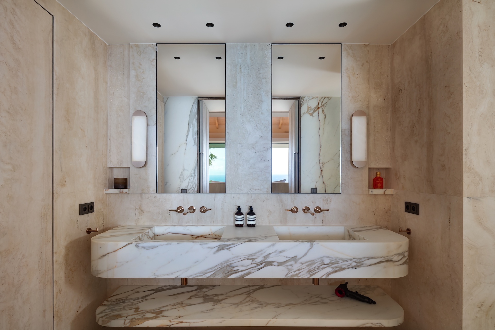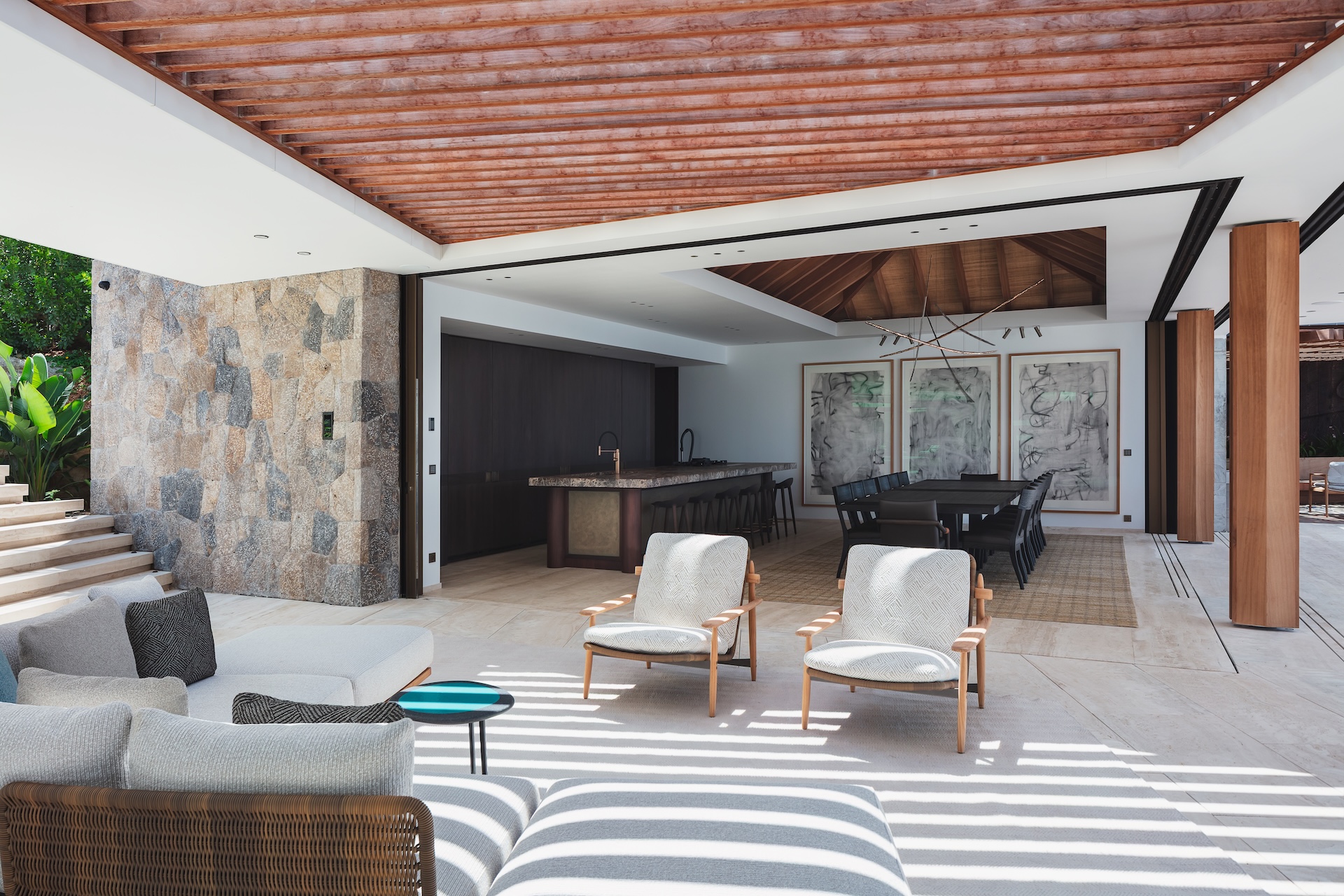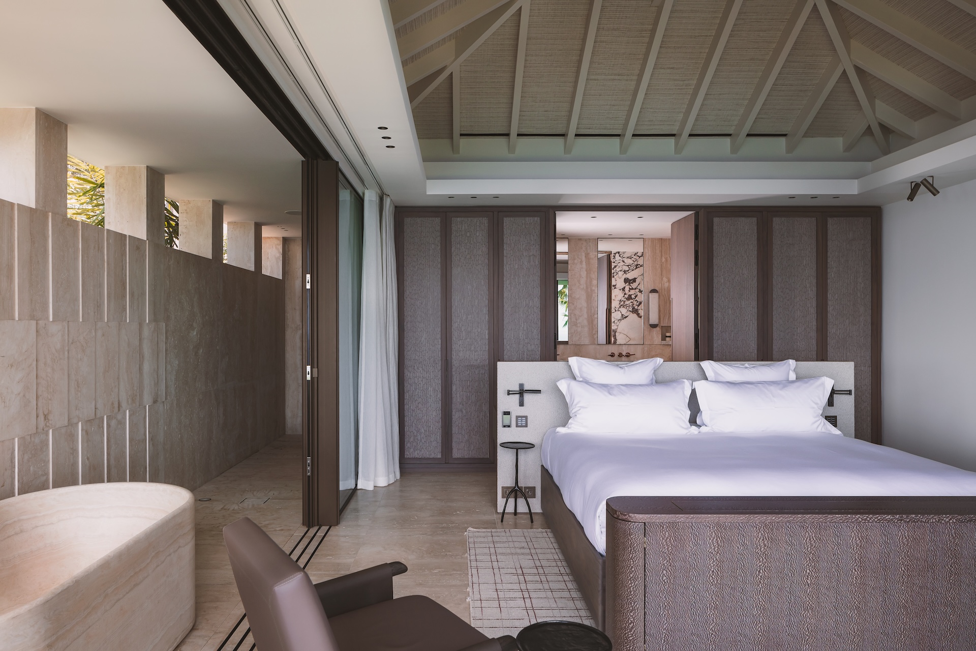 Inside, the villa has been crafted for effortless comfort and elevated living. The fully equipped kitchen features premium appliances—a coffee machine with milk foamer, kettle, refrigerator, wine cellar, ice maker, electric and gas cooktops, oven, microwave, blender, citrus press, juicer, toaster, dishwasher, and glass cleaner—along with a dining table and bar that create an inviting setting for relaxed meals and convivial moments. The living room opens onto sweeping views of the sea and pool, and offers air-conditioning, a ceiling fan, a spacious sofa, a dining area, a smart TV, a high-fidelity sound system, and fiber-optic internet. It is a refined yet welcoming space, ideal for gathering, unwinding, or simply enjoying the light as it moves across the horizon. Luxury here is intentional and understated. Furniture by design luminaries such as Christian Liaigre blends with bespoke commissions and Minotti’s sophisticated outdoor pieces, all anchored by noble materials. Italian marble veined like a topographical map, time-softened woods, and richly textured fabrics come together in perfect harmony. At Omai Zilé, beauty is crafted, curated, and felt in every detail.