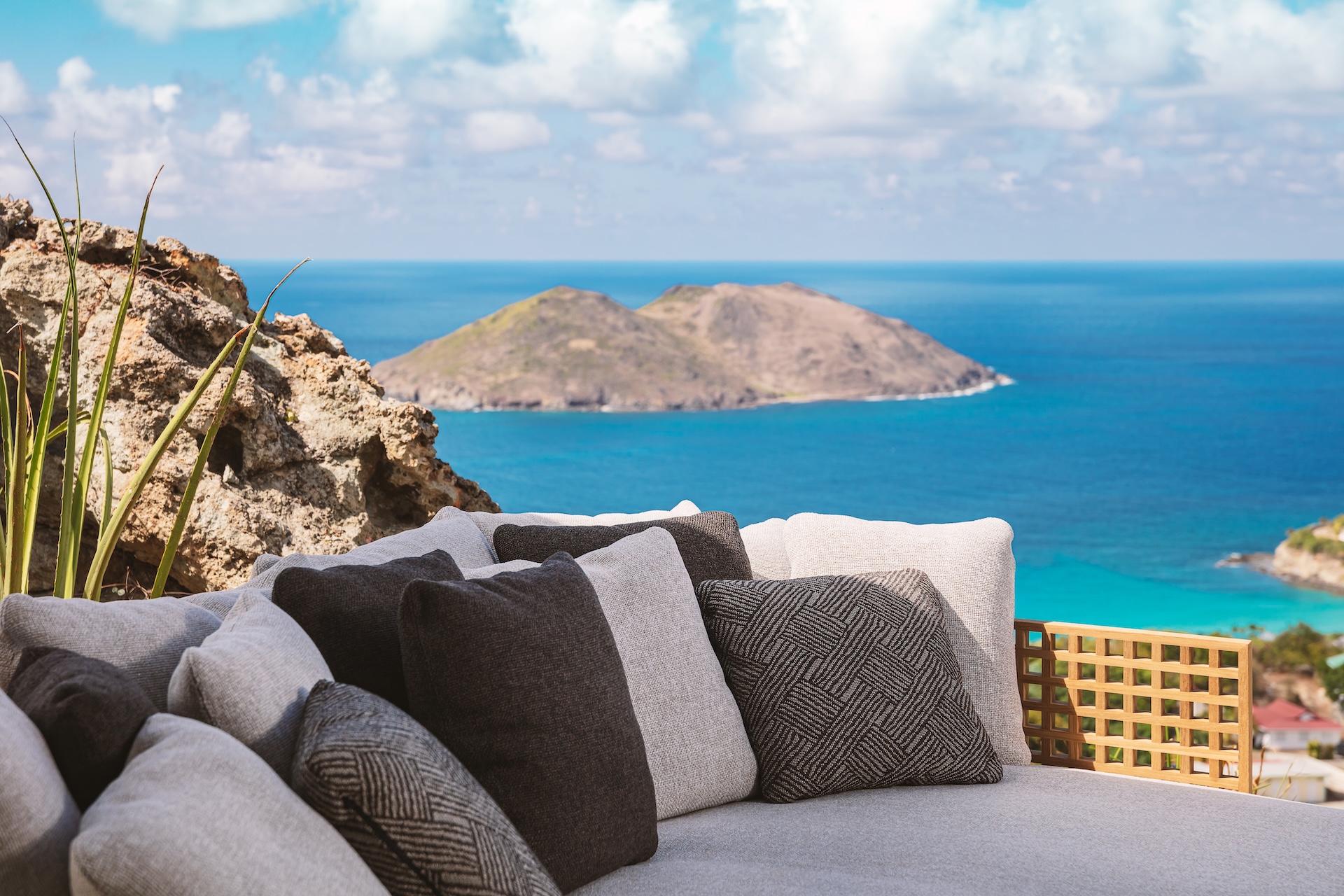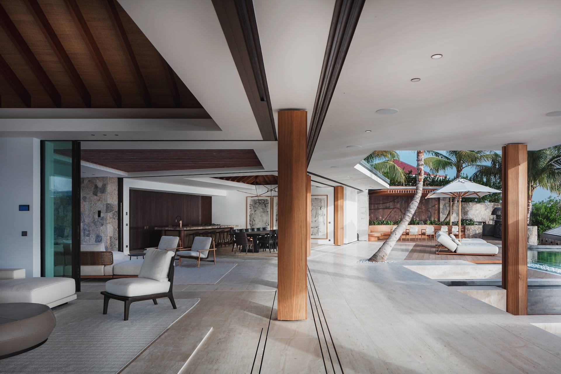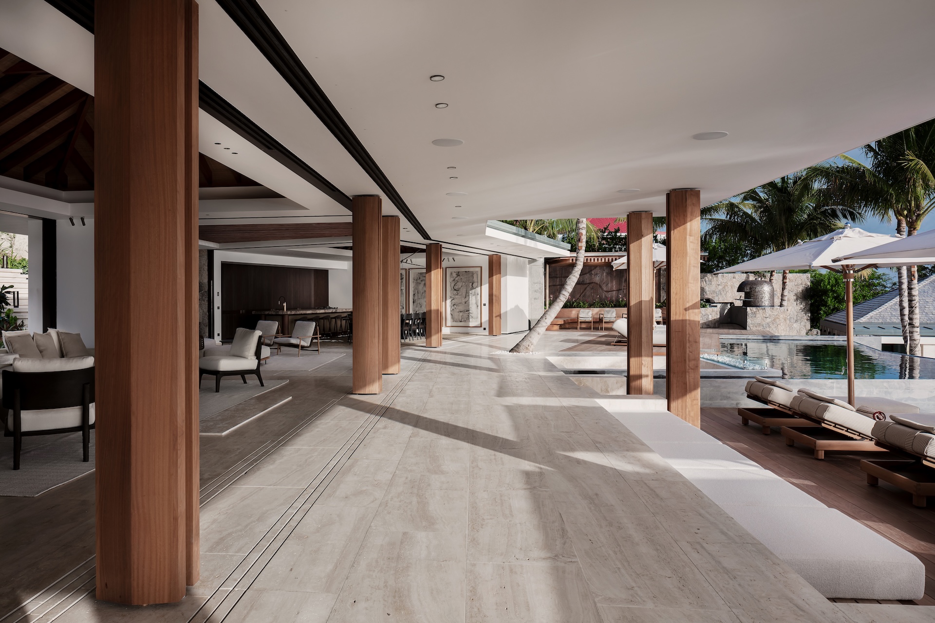 The outdoor spaces at Omai Zilé are designed as a series of serene, sun-filled living areas. Multiple terraces follow the light throughout the day, offering places to lounge, dine, or gather around the brasero as the evening settles in. A tranquil pond with native fish adds a calming, meditative touch to the landscape. Both the front and back gardens create refined settings for private events or relaxed entertaining under the Caribbean sky. With sweeping sea views, two heated pools, generous sunbeds, shaded lounges, and a fully equipped outdoor kitchen with a barbecue and pizza oven, the exterior becomes a seamless extension of the villa’s elegant lifestyle.